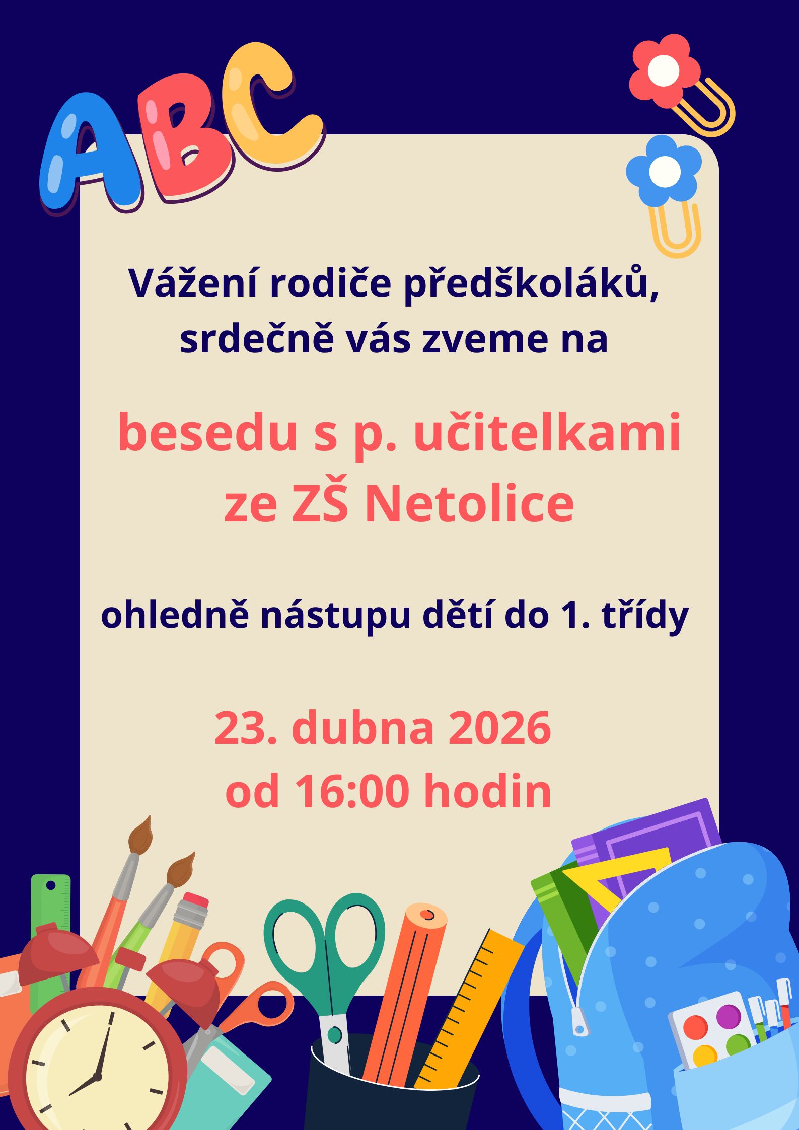16.6. 2026 v 16,00 proběhne slavnostní pasování předškoláků spojené s pohádkou.